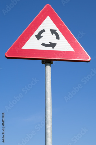 roundabout, weaving, swirled, ring, triangular, warning, arrow, caution, traffic sign, roadsign, traffic, signs, street, regulation, dutch, holland, holland, driving, driving school, sky, blue, information