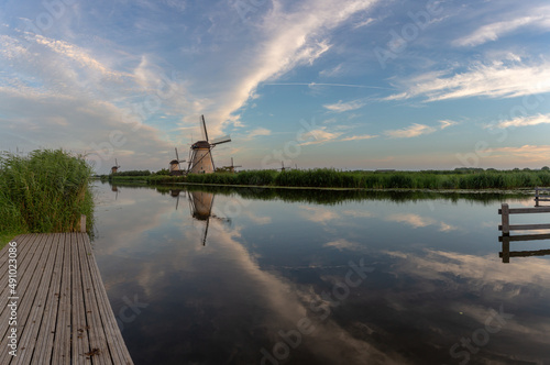 Dutch traditional windmill reflection and platform by the water at Kinderdijk Netherlands