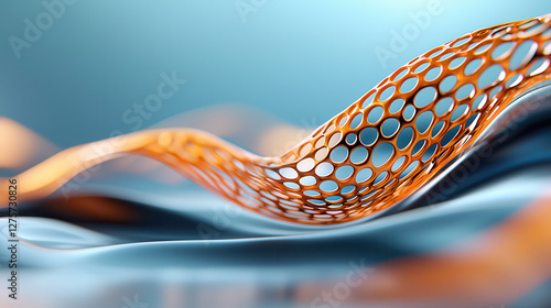 dynamic abstract wave motion is created by interconnected geometric shapes, featuring vibrant orange mesh structure against smooth blue background, evoking sense of fluidity and innovation