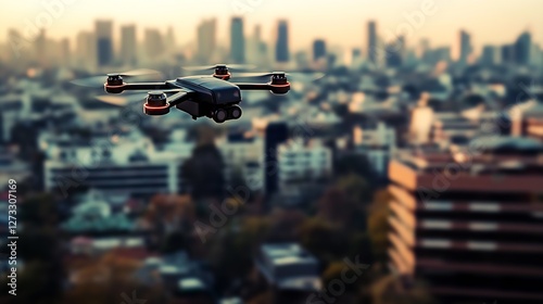 Dynamic aerial view of a cutting-edge drone hovering above a vibrant cityscape at dusk : Generative AI