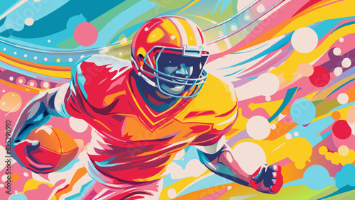 american, football, player, dynamic, vibrant, illustration, sport, athletic, action, colourful, art, design, movement, speed, run, helmet, uniform, energy, pop, style, abstract, background, bold, bright, competitive, game, gridiron, power, rush, touchdown, strength, determination, male, agility, performance, professional, team, texture, motion, artistic, creative, energetic, fantasy, modern, play, skill, vector