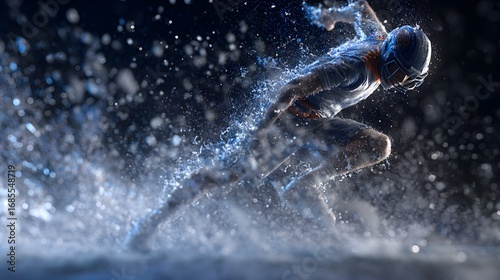 Dynamic American football player sprinting through splashing water, action shot, powerful, athletic, competitive spirit.
