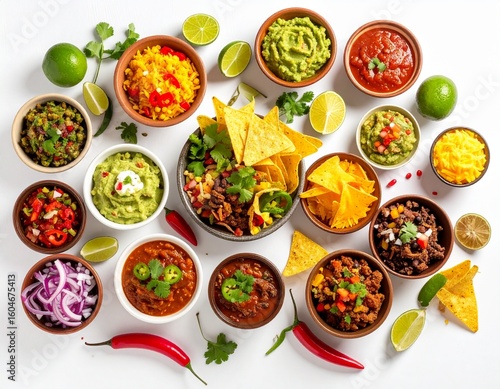 mexican, food, overhead, cookery, taco, guacamole, salsa, nacho, burrito, chili, avocado, lime, corn, bean, cilantro, tomatoes, onion, spicey, traditional, authentic, colourful, vibrant, studio, white, background, cinematic, natural, light, high, resolution, sharp, sharpened, ingredient, closeup, photo, editorial, professional, epicure, plating, delicious, culture, ethnic, detailed, presentation, eatery, artistic