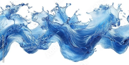 Dynamic and fluid blue water splash frozen in motion with droplets scattering against a white background