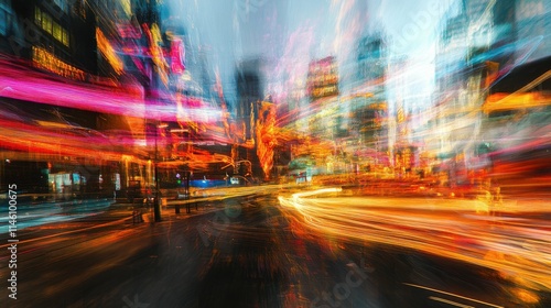 dynamic cityscape with long exposure light trails, vibrant and energetic, focus on movement and urban life