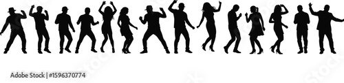 Dynamic crowd of diverse people silhouettes dancing and celebrating, perfect for themes of party, music, events, joy, and energetic social gatherings and entertainment.