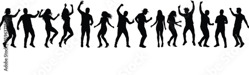 Dynamic crowd of diverse people silhouettes dancing and celebrating, perfect for themes of party, music, events, joy, and energetic social gatherings and entertainment.