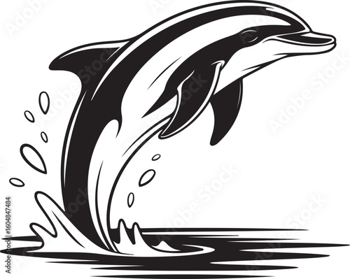 Dynamic Dolphin Leaping Out of Water Vector Illustration in Black and White on Transparent BG