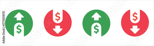 Dynamic Financial Icon Set Vector Illustration. Featuring Dollar Up Symbol, Money Down Icon, and Price Low Arrow Sign in Flat Style for Business and Stock Market Graphics.