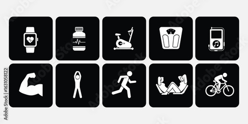 fitness, sport, exercise, physical exercise, health, activity, icon, set, muscle, bicep, running, cycling, weight scale, gym, training, healthy lifestyle, bodybuilding, isolated, vector, physical, icon, symbol, illustration, signs, buttons, design, medicals, business, web, pictogram, medicine, cyberspace, flat, hand, silhouette, baby
