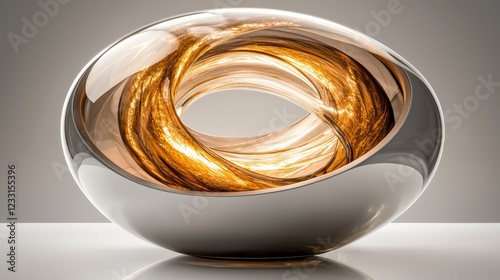 Dynamic glass sculpture showcasing golden swirls art gallery 3d art modern environment close-up view contemporary design