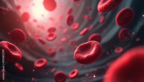 Dynamic illustration depicts red blood cells moving through dynamic environment. Scientific visualisation of blood flow, medical anatomy, cell structure, healthcare. Biology, medicine, health concept.