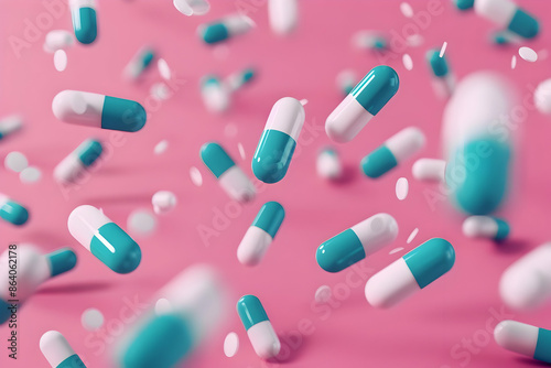 Dynamic image of teal and white capsules on a pink background, illustrating the concept of pharmaceuticals and medication in modern healthcare.