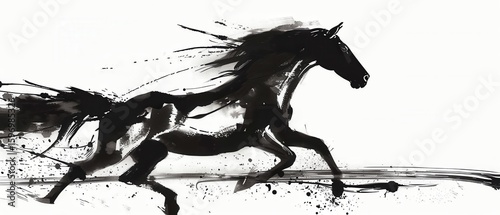 horse, galloping, silhouette, ink, dynamic, splash, zen, painting, movement, dramatic, isolated, figure, black, white, monochrome, equestrian, energy, power, grace, speed, fluid, abstract, art, illustration, minimalist, traditional, calligraphy, gesture, brushwork, splatter, dark, light, contrast, motion, flowing, tail, mane, hoof, canvas, grain, texture, strength, elegance, freedom, spirit