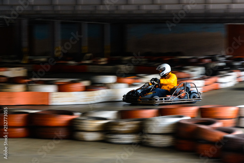 Dynamic karting competition at speed with blurry motion on an equipped racecourse