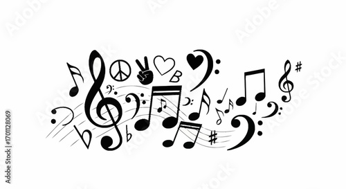 music notes, treble clef, nubes, peace sign, graphic design, melody, harmony, rythm, musical instrument, sheet music, decorative, pattern, texture, background, wallpaper, template, design element, digital artwork, vector, illustration, geometric, creative, musical score, black-and-white, minimalist, artistic