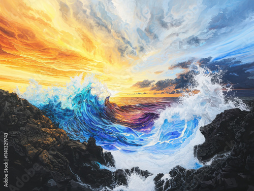 Dynamic ocean waves at sunset coastal art vibrant colors nature captivating perspective modern aesthetic artwork