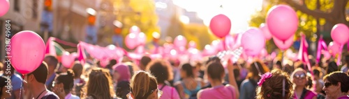 Dynamic photo of a breast cancer awareness march, with participants holding pink banners and balloons, diverse crowd and energetic atmosphere