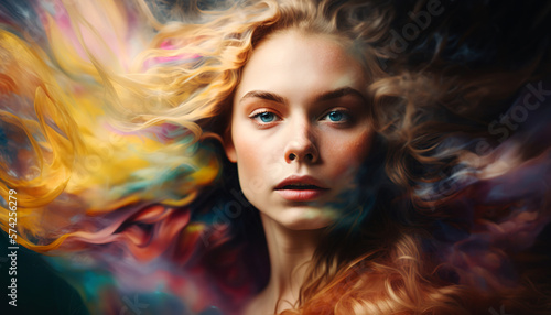 Dynamic portrait of woman with ethereal inner beauty flowing from within. Generative Ai.