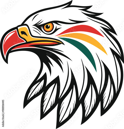 eagle, bird, head, powerful, striking, closeup, illustration, bold, beak, piercing, yellow, eye, colourful, stripes, forehead, majestic, intense, iconic, animal, wildlife, bird of prey, nature, design, graphic, vector, artwork, art, symbol, freedom, power, courage, strength, predator, fierce, sharp, sharpened