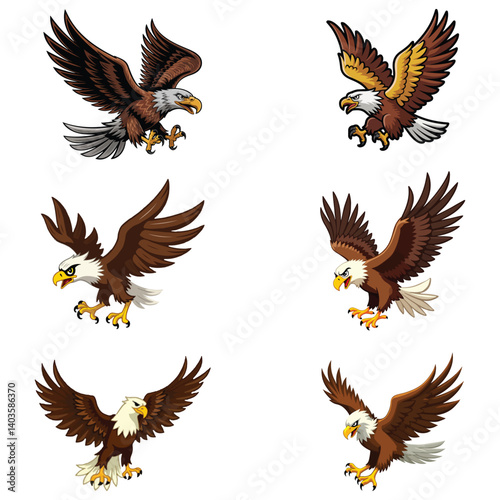 Eagles. Bird king set. 6 eagles. An attacking eagle flying in the sky with a large wingspan.