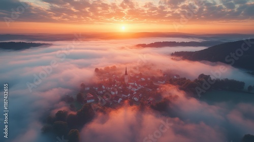 early morning drone view of foggy rural landscape with sunrise over small town in bavaria