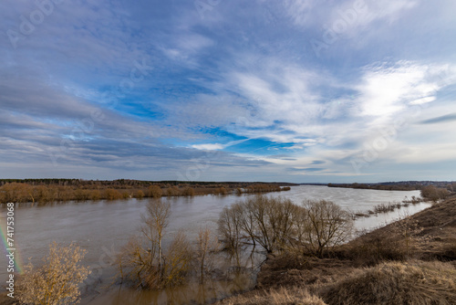 early spring flood, high water in the countryside, river overflowing its banks, trees in the water, flooded banks, environmental pollution, ecology
