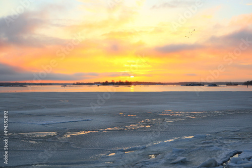 Early Spring Sunrise over Partly Frozen Sea in Finland