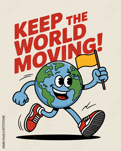 earth, running, flag, cartoon, character, retro, motivation, sustainability, planet, earth, illustration, globe, movement, action, happy, eye, sneaker, keep, moving, vector, design, positive, energy, ecology, awareness, environment, save, future, progress, growth, development, global, harmony, oneness, challenge, effort, speed, pace, motion, journey, adventure, goal, success, graphic