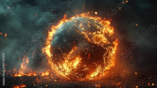 Earth covered in smog and fire, symbolizing the irreversible damage caused by climate change and rising temperatures.