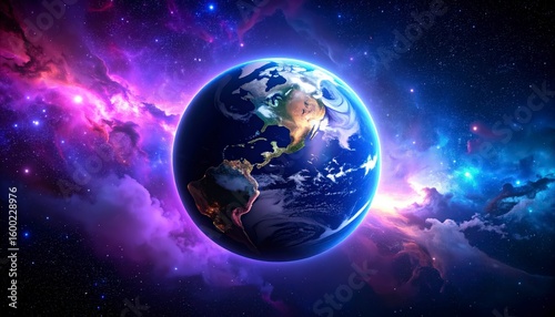 Earth from space surrounded by colorful nebula gas clouds, purple and blue tones