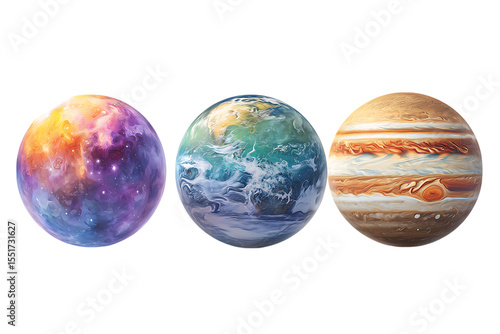 Earth, Jupiter, and a nebula planet. Space, universe, astronomy.