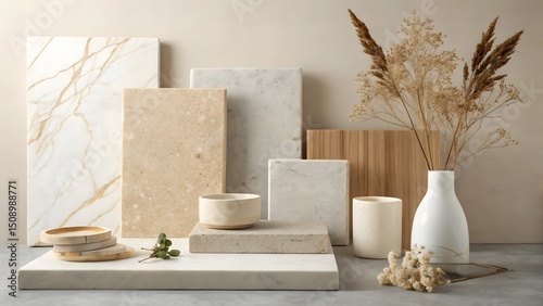 still life, earthy, sophisticated, elegant, minimalist, beige, white, brown, cream, stone, marble, travertine, wood, ceramic, vase, dried flowers, decor, home decor, interior design, display, background, texture, surface, composition, aesthetic, calm, serene, warm tones, natural light, shadow, organic, abstract, art, design, sample, swatch, tabletop, natural stone, modern, residential, commercial, luxury