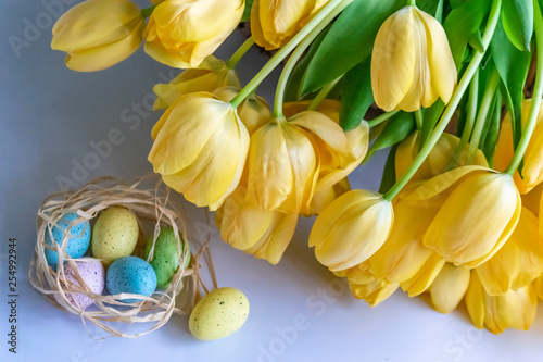 Easter background with yellow tulips and painted eggs. Traditional Christian Easter symbols.