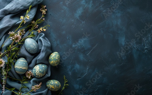 Easter banner with painted eggs and napkin on dark blue background
