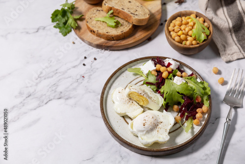 Easter breakfast or brunch. Poached egg and beet salad with spinach, cheese feta, chickpeas on a marble tabletop. Copy space.