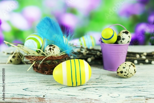 Easter composition of a basket, colored eggs and feathers on a wooden table, against the backdrop of spring nature, a traditional decoration for the holiday, congratulations, postcard