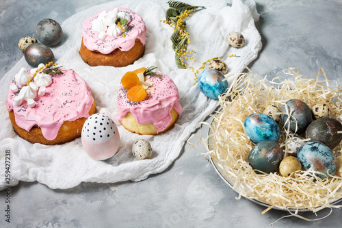 Easter composition with orthodox sweet bread, kulich and eggs on concrete background