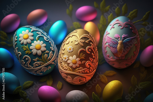 Easter eggs in the nest with flower patterns on dark background. 3d illustration