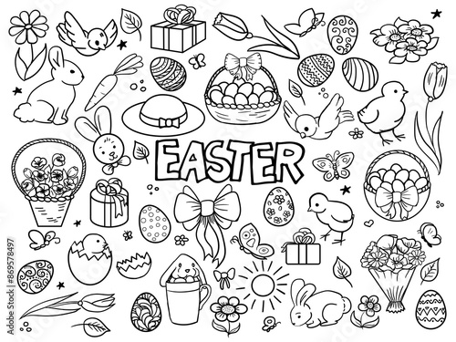easter, design, element, line art, black-and-white, colorless, doodle, hand-drawn, background, illustration, cartoon, egg, basket, chicken, spring, celebration, hat, easter bunny, rabbit, butterfly, carrot, gift, flower, sun, painted eggs, bow, ribbon