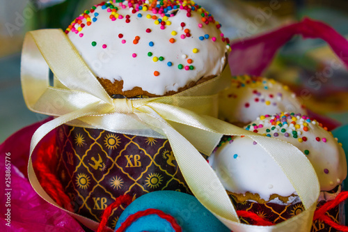 Easter Holiday. Sweet pasques on the table decorated with colored sugar and eggnog cream. Interesting decorations in home baking. Spring mood on the table for Breakfast. A delicious dessert in April.