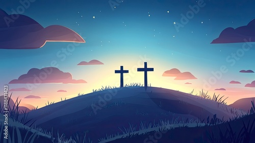 Easter illustration with three crosses on hill and blue sky at dusk.