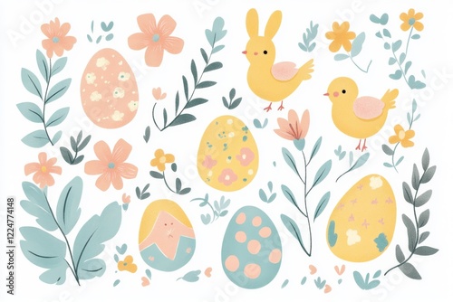 rabbit, chick, egg, floral arrangement, white background, cute, adorable, spring, holiday, celebration, illustration, card, decoration, seasonal, festive, colourful, playful, whimsical, fun, easter egg, design element