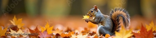Eastern gray squirrel amidst fallen maple leaves, fall colors, maple leaf, forest floor