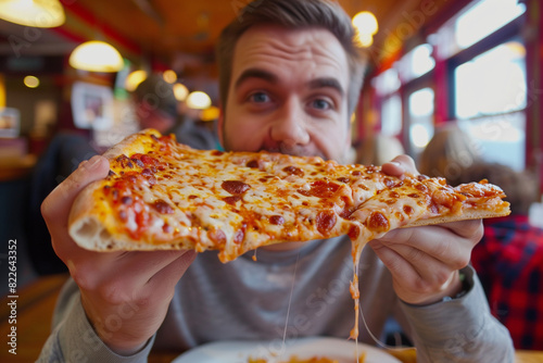 Eating giant fast food pizza, devouring a large and greasy meal, ideal for anyone feeling extremely hungry and in need of a satisfying feast