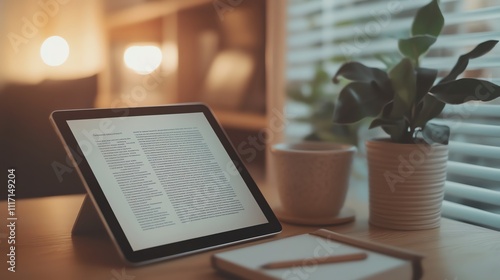 E-book mockup on a tablet showcasing an elegant design, placed on a simple desk with soft lighting to emphasize the content's readability