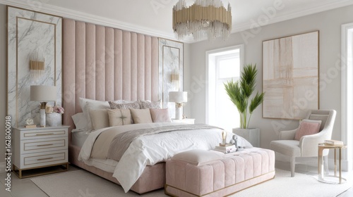 eclectic art deco bedroom full view, upholstered headboard in blush pink, marble bedside walls, gold trim details, soft natural light