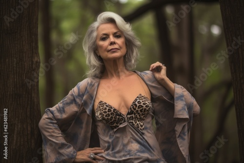 Eclectic portrait photography of a glad mature woman wearing a intimate apparel against a wildlife reserve background. With generative AI technology