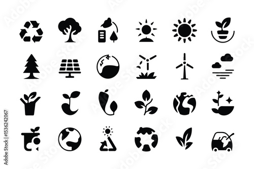 eco, sustainability, icon, environment, green, nature, conservation, renewable, recycling, energy, solar panel, wind turbine, electric car, compost, rain, river, ocean, leaf, tree, forest, reforestation, pollution, emission, factory, clean energy, biodegradable, organic, environmentally friendly, climate change, global warming, globe, earth, protection, wildlife, biodiversity, natural, vector, set, glyphs, pictogram, silhouette, illustration, symbol