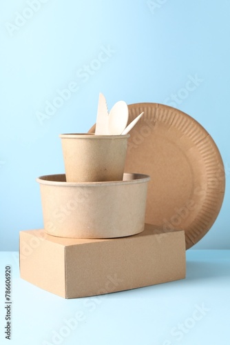 Eco friendly food packaging. Paper containers and tableware on white table against light blue background